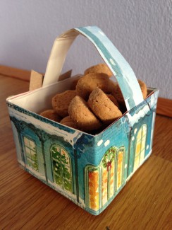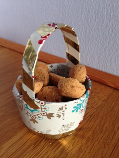 Jeg grublede i flere måneder over, hvad mælkekartonerne kunne forvandles til og spurgte endda andre kreative til råds på facebook gruppen: Genbrug! vi gør gammelt til nyt igen….Up cykling for kreative, hvilket førte til mere end 150 kommentarer med gode forslag om at bygge skamler, tømmerflåder m.m. (i øvrigt en fantastisk gruppe!). Jeg ville nødigt ende op med en kæmpe papting, som hurtigt ville blive uinteressant, falde sammen og dernæst blive til affald, og som der ikke mindst var blevet brugt en masse nye ressourcer, som f.eks. lim og maling, på at bygge. Ideen om tømmerflåden og legehuset blev derfor hurtigt forkastet. Til Halloween havde jeg planer om at bygge en kæmpe mumie til forhaven, men jeg fik ikke tid, og den havde ligesom de andre store ting også været svær at bruge eller skaffe sig af med efterfølgende. Flere gange overvejede jeg at give mine pigers SFO mælkekartonerne til deres kreaaktiviteter, men jeg ville gerne have et par gode forslag til, hvordan de kunne bruges. Her i November fik jeg så endelig en god idé og fik fremstillet forskellige skabeloner til julepynt og gaveæsker af mælkekartoner. Først er der pebernøddekurven.