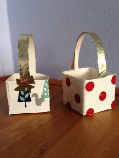 Jeg viste en af pædagogerne kurvene og forslog SFO’en at få alle mælkekartonerne til deres juleworkshop i værkstedet. De sagde heldigvis ja, for vi var trætte af at have dem stående, og desuden kom de på den måde rigtig mange til gode som hobbymateriale. Senere lavede jeg også forskellige modeller af gaveæsker til inspiration, som de fik ned i SFO’en.