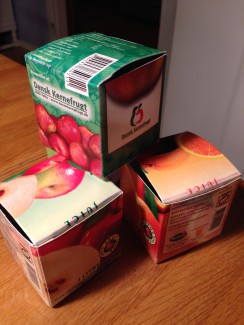 Mine piger er kommer hjem med flere fine julekurve af juice- og mælkekartoner her er bare to af dem.