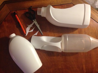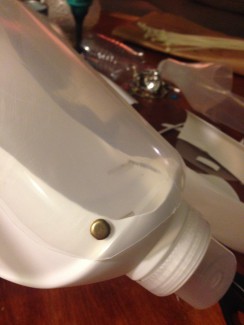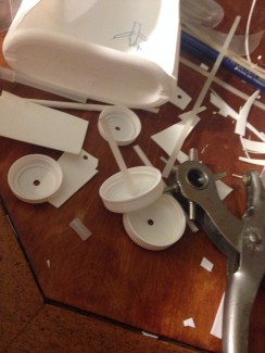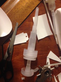 Selve flyverens krop er en stor dunk til flydende vaskemiddel, der er skåret igennem med en hobbykniv.