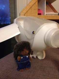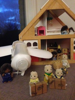 Det har ikke været en rigtig december med genbrugsnissen, før han har lavet noget gak i dukkehuset. Og det var, hvad han gjorde i går, da vi fandt dukkehuset pænt ryddet op og dyrene klar til afgang med en stor hvid flyver, der var parkeret foran huset.