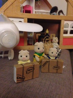 Her får du et par billeder mere fra rejsescenen. Et af morgris, der har pakket en madkurv og badeanden, og et af de spændte griseunger med hver deres rejsekuffert.