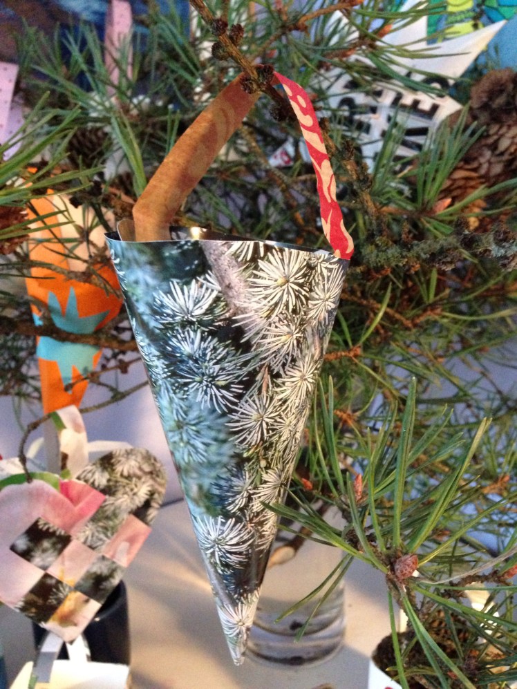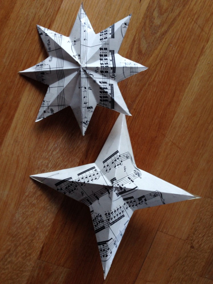 Og så tog det fart med julestjerner lavet af alt fra tegneserier til plakater og nodepapir. Se f.eks. her nogle smukke stjerner, der er klippet ud af en bog med fotografier af træer.