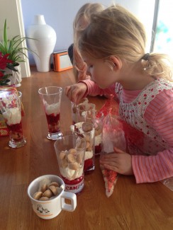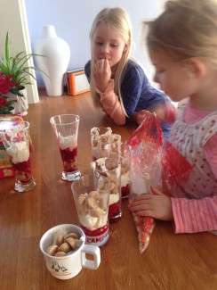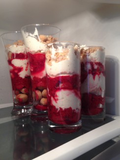 Min blog handler mest om genbrug af ting, tøj og møbler, men nu sniger der sig også et lille indlæg om madspild ind. For sidste jul havde Netto økologiske pebernødder på hylderne (sådan Netto!), og jeg fik købt rigeligt – så mange, at de ikke blev spist op i julen og til sidst ikke var sprøde længere. Hvad gør man så, når udløbsdatoen endnu ikke er overskredet og det er synd at smide dem ud? Ja, så opfinder man en “skæv” men mod forventning lækker januardessert – med pebernødder. Det er vel nærmest en pebernøddetrifli med lag af jordbærkompot, pebernødder og flødecreme.