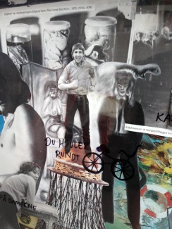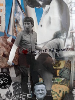 Her forsøger jeg mig med placeringen af fotografierne, der er blevet sat på baggrunden med lim fra en limpistol. Limpistolen har den fordel, at den tyktflydende lim løfter fotoet nogle millimeter over baggrunden og giver 3D effekten.
