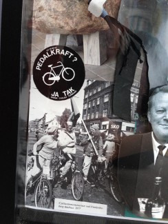 Detaljen her med ‘pedalkraft’ og udklip fra en cykeldemonstration på Frederiksberg i 1977 (for resten det år jeg er født) er blevet ret god, og er taget med da fødselaren har cyklet meget i sit liv.