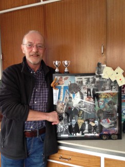 Min kollega blev først sat på opgaven at finde en egnet ramme, der var dyb, så den kunne rumme flere billedlag, og at den skulle være brugt var et must! Han skulle også finde bøger eller udklip og fotografier, der kunne klippe klistres sammen og give et sjovt univers med vennens liv som omdrejningspunkt.