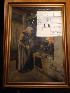 Da jeg elsker en god genbrugsudfordring og gerne ville hjælpe, lagde jeg hovedet i blød, for at få den helt rigtige idé. Vi talte også frem og tilbage om, hvad gaven kunne bestå i. Måske et møbel, men det var svært at komme på et, som man ikke allerede har anskaffet sig i løbet af 70 år. Jeg foreslog et brugt maleri, som så skulle piftes op med en ny farve på rammen, eller som fik tilføjet nye illustrationer, som males oven på det eksisterende motiv. Noget a la de billeder, som jeg engang har købt i en af Kræftens Bekæmpelses butikker. De var del af en konkurrence i butikken kaldet ‘Ny kunst i gamle rammer’, hvor deltagerne skulle lave ny kunst oven på gamle maleriers motiver. Et koncept som jeg er vild med, og som der er kommet nogle humoristiske ‘nye’ billeder ud af. Se her det første, der forestiller en kvinde fra gammel tid, der drømmer om et moderne køkken til fordel for ildstedet, som hun står ved.