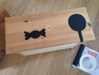 Da jeg gik i gang med istandsættelsen havde jeg bestemt mig for at male skufferne i forskellige farver. Jeg havde masser af hvid træmaling fra maling af vores paneler i huset tilovers, som kunne blandes med små blandingsfarver fra farvehandlen. Jeg talte med min datter om at skufferne kunne have forskellige temaer – f.eks. en slikskuffe, og så opstod ideen til udsmykningen af den første skuffe.
