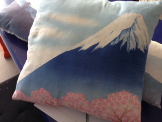 Vi havde mange liter hvid væg- og træmaling tilovers fra istandsættelsen af huset. Jeg har engang, som barn, set min mor bruge små blandingsfarver i hvid maling til væggene på mit børneværelse, der fik en fantastisk æble/limegrøn farve. Samme trick skulle afprøves, men jeg ville gerne male flere farvede felter – faktisk ville jeg forsøge mig med et helt vægmaleri. På Pinterest havde jeg set en flot væg malet med skygger af bjergkæder i forskellige blå og grå nuancer, som min datter også syntes om. Det gode ved bjergtemaet er at det er enkelt, så man ikke bliver træt af motivet, og så kan det laves med mange smukke pastelfarver. Jeg søgte også inspiration i vores japanske sofapuder med bjerge på.