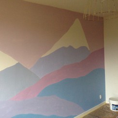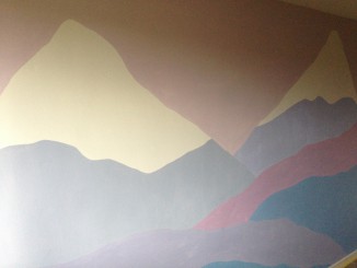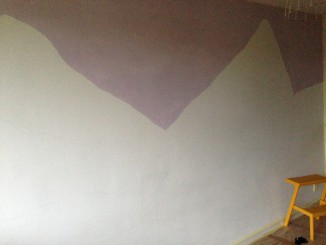 Min datter er 9 år og jeg håber, at bjerglandskabet vil falde i hendes smag i mange år endnu, selv på et teenageværelse måske. Farverne er lidt ferske, så vi overvejer at tilføje nogle træer eller fugle af blomstrede tapetrester. Nu må vi se, hvad vi finder på – følg med her på bloggen, hvis du er nysgerrig. Forslag til tilføjelser modtages også gerne eller andre ideer til brug af malingrester 🙂