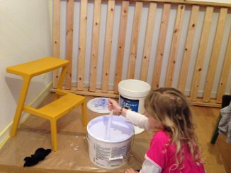 Jeg gad godt at vide, hvor mange malerspande med rester af maling, der bliver smidt ud eller står på lofter, i kældre, skurer osv. og aldrig bliver brugt op? Mit gæt er mange med litervis af brugbar maling, der som tiden går, bare går til spilde. Her er en idé til, hvordan malingrester kan bruges, hvis altså du tør indrette dig lidt spraglet, eller som jeg skal indrette et børneværelse, hvor der gerne må være mange farver på drengen 🙂