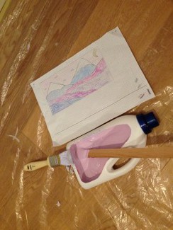 Tegningen brugte jeg til at måle op og sætte punkter på væggen efter, som jeg derefter kunne tegne udfra. Vi farvelagde også tegning og forsøgte at blande farver derefter, hvilket lykkedes nogenlunde. Et lille genbrugsfif er at bruge plastikdunke til at blande farver i. Vaskemiddelbeholderen her er fx et topsmart stykke malerkit – med håndtag.