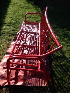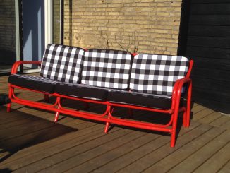 Jeg skal indrømme, at det ikke er det mest bæredygtige projekt, for der gik mange spraydåser til bare sofaen alene. De mange små bambuspinde gav mange smalle flader, der var svære at ramme, uden at der gik maling til spilde. Jeg overvejer at anskaffe mig en genopfyldelig spray til kommende projekter, for at undgå spraydåseaffald. Alternativt findes der svanemærket spraymaling, som den ene sorte stol er malet med, der er mindre miljøbelastene, men dåseaffaldet undgås ikke. Til trods for, at istandsættelsesprojektet nok ikke er hverken særligt ressourcebesparende eller miljøvenligt, håber jeg til gengæld på at få glæde af møblerne i mange år.