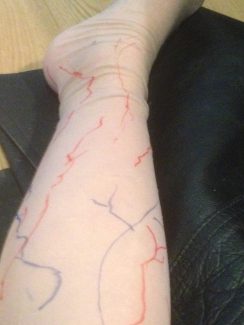 Supernemt – frembragt ved hjælp af permanent/sprittusch. Strømpen holdes lidt ud fra benet imens man tegner, så der ikke kommer tusch på benene. Man kunne også forestille sig skællede hekseben, mumiebandager, sømandstatoveringer og meget andet tegnet op med tusch på en brugt strømpe.