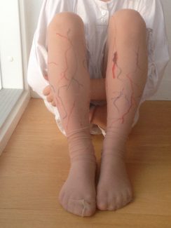Men nok om græskaret, for indlægget her skal handle om hullede nylonstrømper, der hos mig opmagasineres i en æske på hobbyværelset. Jeg har indtil videre ikke brugt dem til andet end et par projekter med lampeskærme, men nu fik jeg brug for flere par til pigernes halloweenkostumer. Min yngste datter, der ville klædes ud som zombie med et strejf af Mary fra Riget (min klamme idé), tog for sjov mine gamle hudfarvede nylonstrømper på, og så opstod ideen til denne makeover med blodsprængninger.