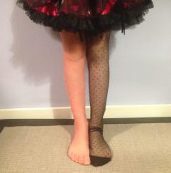 Til min ældste datters Monster High kostume fik vi også brug for de brugte strømpebukser. To stk. med forskelligt mønster, i hver sin farve og kun med et ben i hver, da det andet var brugt til at betrække lampeskærme med. Meget simpelt, men det så sødt ud til strutskørtet.