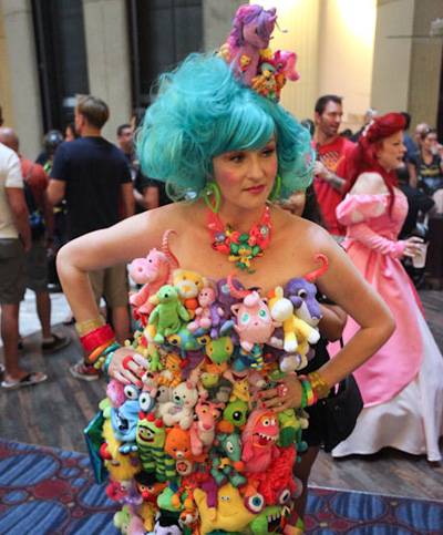 Bamseoutfit af nogle af de (skræmmende!) mange bamser, der bliver købt og efter kort tid smidt ud igen. Fotoet er sammen med paraply-flagermusen nedenfor fundet på en upcycling blog i indlægget her.