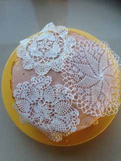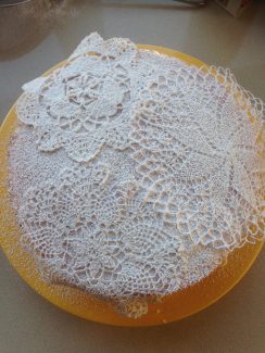 I skal lige se ‘kniplinge-kage-tricket’, som jeg har brilleret med til fødselsdage et par gange nu. Så nemt og så fin en lagkagedekoration. Det eneste du skal bruge er gamle (ja, eller nye) kniplinger, hæklerier (fx en dug) eller blonder og så flormelis.