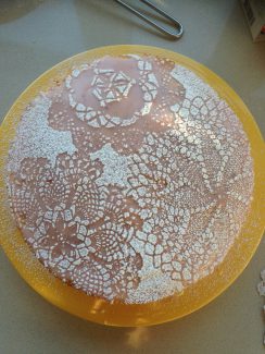 Glasuren skal være helt tør, for ellers optages flormelismønstret i glasuren og forsvinder. Som du måske kan se, er det de kniplinger med mange små huller, der fungerer bedst. Har du ikke flakoner, duge eller lignende i forvejen, så kan du uden tvivl finde dem i din lokale genbrugsbutik. Jeg har både vasket mine i hånden og i maskine og det er gået fint med mindre de har været helt møre.