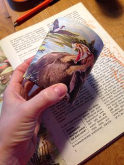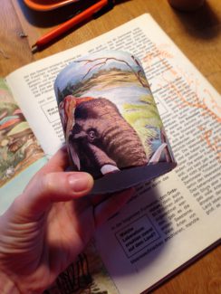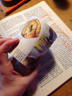 På lørdag fra kl. 11-15 er jeg heldig også at være del af byen med en lille workshop. Her kan man lave holdere til blyanter mm. med paprør, brugte bøger mm. Som den her med forhistoriske dyr – en gave til en dreng, der fyldte 6 år.