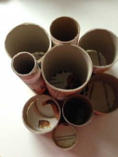- Beklæd de forskellige rør med papir fra fx en billedbog, et atlas, ugeblade, tegneserier eller lignende. Papiret kan både sættes fast med limstift eller tapetklister. Pas på med ikke at komme for meget tapetklister på for så kan det godt klumpe under papiret.