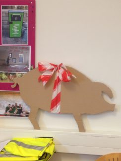 Og til lidt skævt julepynt på kontoret. Papgris med afspærringsbånd. Så populær (eller måske det modsatte), at den blev stjålet fra gildesalen til julefrokosten.