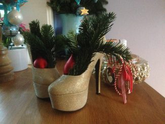 Der opstod også en anden alternativ juledekoration med et par kæmpehøjhælede sko, som egentlig var en indflytter gave til en veninde (i fræk kombination med et retro forklæde), men som jeg fik lige lurk tilbage i årets pakkeleg 🙂 Nu er hun måske ikke så glad for at være gået af med dem, for de gør sig nu ret godt med gran og julekugler!