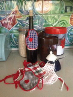 Og jeg kunne heller ikke undvære de her miniforklæder – til juleøl. Her først på vinflaske i mangel af flaskeøl. – Find dem i ‘genneren’ før din nabo 😉