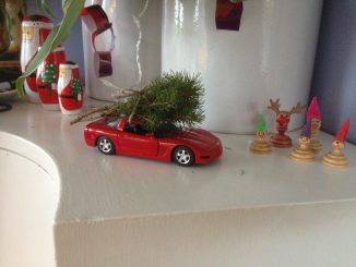 Der er, som du måske kan se, brugt en legetøjsbil, en garnstump og grønt fra haven. Grangrenen er ikke helt autentisk i formen som juletræ, men jeg synes stadig, at det er fjollet at købe et helt nyt stykke julepynt, som det her, med de mange brugte legetøjsbiler, der i forvejen findes. Næste år udvider jeg med flere biler, og vi har også en politihelikopter, der vil være fed som juletræstransporter…
