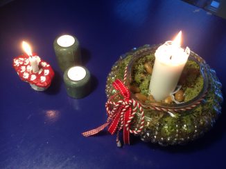 Denne december har jeg også fundet på et par andre skæve løsninger med genbrug. Se fx skålen til min juledekoration, der tidligere har tjent andet formål, men også med lys i 🙂