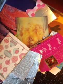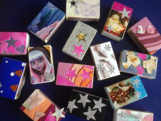 Jeg er lidt træt af de hjemmelavede gaver fra SFO’en og klubben, som ikke altid er lige anvendelige og ofte er præfabrikerede hobbygenstande, som børnene blot skal dekorere og ikke lærer et egentligt ‘håndværk’ af, som fx at sy eller bygge noget fra bunden i ler, træ mm. Men de pyntede tændstikæsker, som pigerne lavede til mig sidste jul, kunne jeg rent faktisk bruge. Derfor var min idé at pynte tændstikæsker med tapetrester og forskelligt kartonaffald fra fødevareemballage, gamle julekort og indbydelser.