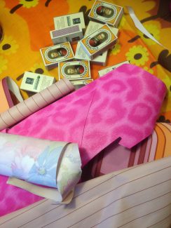 Noget andet som jeg også har på lager – i køleskabet, er tapetklister. Det brugte vi til at lime tapet og karton fast med på tændstikæskerne. Udstanserne her brugte vi også, og de er også gode at have til krea med karton.