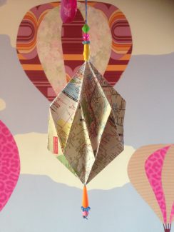 Papirpynten hænger nu på min datters værelse, hvor de også gør sig fint i lysekronen med hendes vægmaleri og tapetluftballoner i baggrunden.