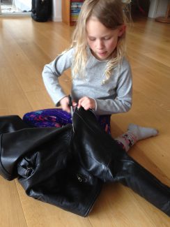 Min datter fik derefter til opgave at splitte den ad i mindre stykker, så læderet kunne bruges på ny. Et super sjovt projekt for en 7-årig!