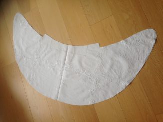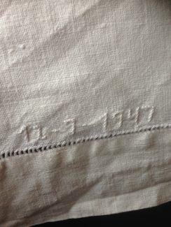 Sidste projekt som indlægget her kommer til at handle om er også en stor pude. Den er syet af en gammel dug med sirligt broderede blomster. Dugen har jeg fået af min veninde, hvis nabo havde foræret hende et større parti duge. Hun kunne ikke bruge dem alle, og jeg blev derfor tilbudt resten og beholdt flere til diverse syprojekter, da jeg som mange andre af min generation sjældent kommer en dug på bordet. Den er syet i 1949, hvilket jeg ved, fordi dato og årstal (12-7-2049) er broderet på dens side.
