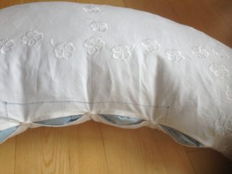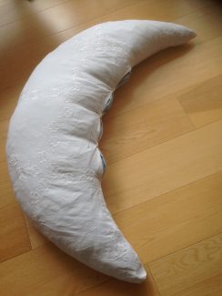 Mønstret til puden har jeg selv konstrueret ud fra behov og dugens størrelse. Den er blevet måneformet og skal tjene flere formål, blandt andet kan den bruges som ammepude og den er her under min graviditet god at sove med, men er oprindeligt tænkt til min ældste datter, der tit har vokseværk og gerne vil sove med benene hævet i sengen. Så er den også blevet pæn og har funktion som opbevaring af en gæstedyne, så den ikke fylder i skabet.