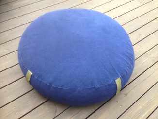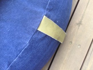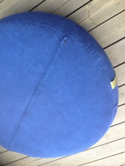 Jeg ligger også inde med et større parti brugte cowboybusker, der alternativt kunne være brugt som betræk, men det ville have givet puffen et andet og mere genbrugsagtigt udseende, som jeg var blevet træt af på sigt – og den er stadig lavet af brugte materialer fra inderst til yderst. Puden er ca. en meter i diameter og passer ind i vores hjørnesofa, men flyttes også rundt af pigerne, der begge med lidt god vilje ligger side om side på den.