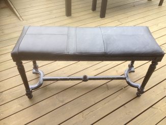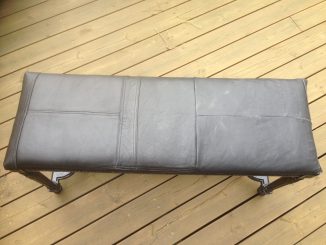 Jakkens læder er meget kraftigt og egner sig derfor godt som møbellæder, og da vores klaverbænk, som jeg tidligere har istandsat, havde fået mange pletter og trængte til nyt betræk, der kunne tørres af efter aftensmåltidet, kreative aktiviteter og lignende, er det meste af jakken blevet til dette nye og efter min mening mega fede betræk.